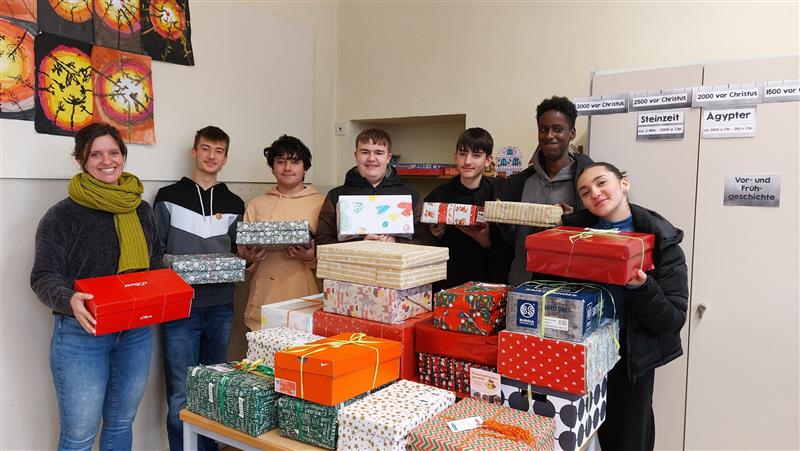 Schon zum dritten Mal haben die Schülerinnen, Schüler, Lehrerinnen und Lehrer der Ulrichschule Geschenke mit Herz gepackt. Das sind Schuhkartons, die mit Geschenkpapier eingepackt und mit vielen nützlichen, schönen und leckeren Dingen bestückt werden. Diese Päckchen werden von der Organisation humedica e.V. abgeholt und zu armen Kindern in Osteuropa gebracht. In diesem Schuljahr hat die Ulrichschule 27 Geschenke mit Herz gepackt. Das ist echt toll! Wir bedanken uns bei allen, die bei der Aktion mitgemacht haben! Eure 9b