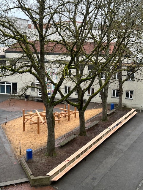 Im Pausenhof wurde ein neues Klettergerüst aufgestellt. Die Schüler*innen warten ungeduldig auf die Freigabe, damit sie es erkunden können.