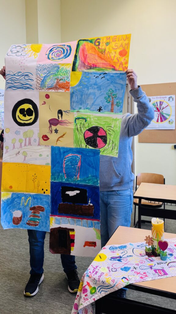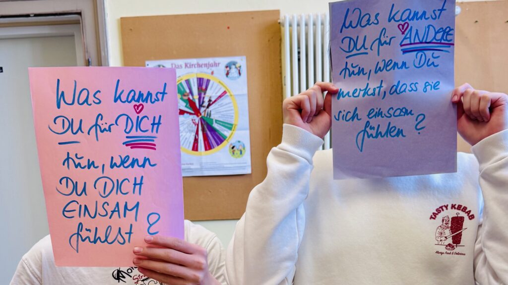 Drei Wochen lang werden für alle Schülerinnen und Schüler der 8. Klassen drei verschiedene Workshops zum Thema „Einsamkeit“ als Projekt angeboten zur Vorbereitung für den Theaterbesuch „Popcorn“. Bei der kreativen Einheit zur Frage „Was tun bei Einsamkeit?“ ist im Reli-Unterricht eine große bunte Collage entstanden. Wenn man sich einsam fühlt, kann es helfen: „Freunde zu treffen“, „Fußball zu spielen“ oder „zu malen“. Auch anderen kann man helfen, indem man „freundlich“ ist und „jemanden zum Mitspielen einlädt“. Und natürlich noch Vieles mehr.